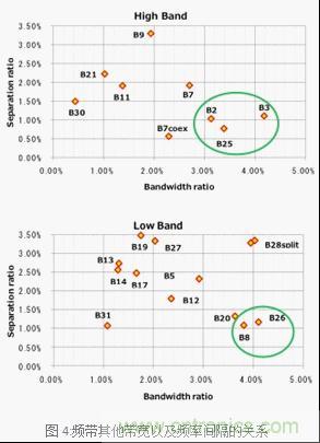 雙工器的設(shè)計根據(jù)Third Generation Partnership Project (3GPP)的規(guī)格根據(jù)頻帶的送信和收信帶寬以及送信端和收信端的頻率間隔(Separation ratio)決定了其難易度。一般來說頻率的帶寬越廣那么送信端和收信端的頻率間隔越小難易度就越高??偨Y(jié)兩者的關(guān)系來看,如圖4。村田制作所正致力于圖4中圈出的部分,計劃優(yōu)先實現(xiàn)TC-SAW對應(yīng)的產(chǎn)品。