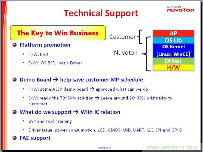 這個是我們目前的所謂的開發(fā)的門檻,其實以新唐的MCP來講,我們做的比較簡單,我們的整個系列都有提供,新唐側(cè)重于在驅(qū)動方面。另外我們公司在深圳科技園也有定期的培訓(xùn)課程。在深圳的本地,我們也有技術(shù)支持。
