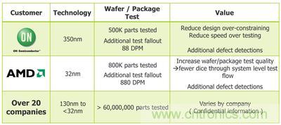 事實證明,單元識別 ATPG 測試法是唯一可以發(fā)現(xiàn)傳統(tǒng)方法檢測不出的缺陷的方法。它可以發(fā)現(xiàn)一套完整的針對固定故障、節(jié)點跳變和時延缺陷的測試方法發(fā)現(xiàn)不了的缺陷,因為這種方法首先就對標準單元進行物理布局時可能出現(xiàn)的實際缺陷進行模擬。在新技術的改進下,單元識別測試法中的測試向量大小得以縮小,但整個測試向量仍大于傳統(tǒng)的測試方法產(chǎn)生的測試向量,因此要進行嵌入式壓縮。許多公司因為采用單元識別測試法而收效顯著。部分成效的概述請見圖1。