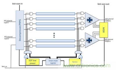 越來越多的客戶在設計相同的電路時同時采用嵌入式壓縮和 LBIST 測試法。由于這兩種技術能夠以類似的方式運用掃描鏈,因此可以將兩者整合成可共享的統(tǒng)一邏輯,從而幫助客戶更有效地運用這種方法。綜合測試邏輯架構請見圖2。