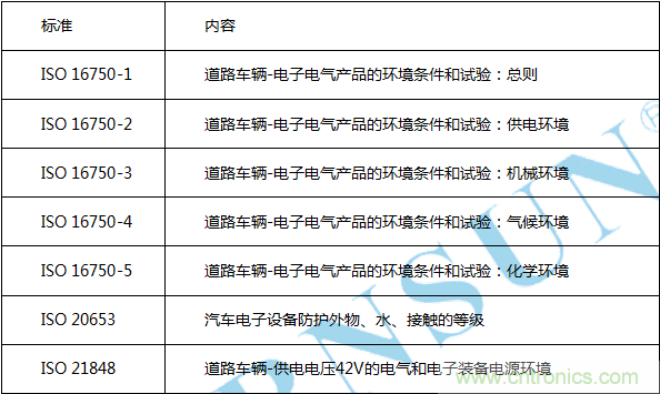 ISO 16750 系列標準是國際標準化組織ISO 最近幾年推出的針對汽車電子的環(huán)境可靠性標準,該標準是歐系車常用的標準,并且逐漸被世界各國轉(zhuǎn)化為國家標準,也逐漸被各企業(yè)標準所引用,成為應(yīng)用比較廣泛的汽車電子的環(huán)境可靠性標準。該系列標準包括五個部分: