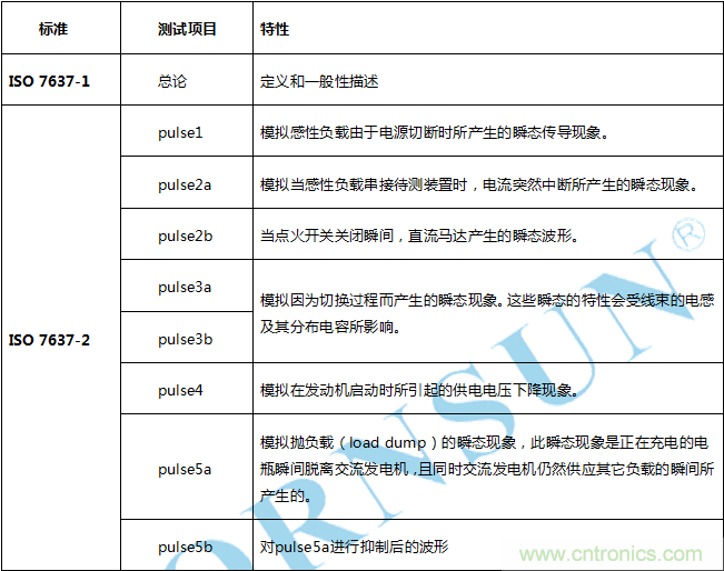針對汽車電子自身產(chǎn)生的干擾,國際無線電干擾委員會(CISPR)對汽車電子業(yè)提出了嚴格的要求,尤其是車載收音機、數(shù)字電視、導航設(shè)備都是這種干擾的重災區(qū)。所以 CISPR25:用于保護車載接收機的無線電騷擾特性的限值和測試方法,對汽車電子自身的發(fā)射狀態(tài)也有了明確的等級判定。EMS方面的測試項目如下所示: