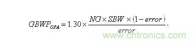 就該電路而言,如果您想要容許放大器 0.05 的增益誤差,同時您知道因產(chǎn)品和溫度的不同,放大器的 GBWP 會改變 30% 最大值,則您需要一個具有 247 MHz GBWP 的放大器。產(chǎn)品選擇部分的指導(dǎo)公式如下: