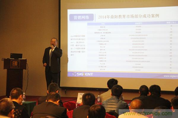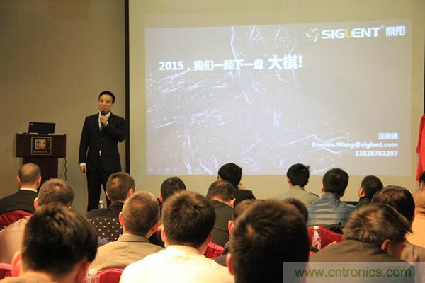 會(huì)議伊始,鼎陽(yáng)科技董事長(zhǎng)兼總裁秦軻先生進(jìn)行了精彩致辭,總結(jié)了鼎陽(yáng)科技在2014年取得的巨大成就,展望了鼎陽(yáng)科技在2015年的宏偉前景,為鼎陽(yáng)科技在新一年的持續(xù)高速增長(zhǎng)擺下了棋陣。2014年鼎陽(yáng)科技的銷(xiāo)售額增長(zhǎng)了41%;MSO2000、SDS3000、SDM3000在取得了眾多工藝上的突破之后順利量產(chǎn)。去年,鼎陽(yáng)科技美國(guó)分公司在克里夫蘭正式成立,為北美市場(chǎng)的下一輪增長(zhǎng)做了堅(jiān)實(shí)的鋪墊。2014年,鼎陽(yáng)科技參加了海內(nèi)外的多個(gè)大型展會(huì),標(biāo)志著鼎陽(yáng)科技正式立足于測(cè)試測(cè)量?jī)x器領(lǐng)域主流品牌的行列。與此同時(shí),鼎陽(yáng)科技與廣州工業(yè)大學(xué)深度合作,建立了聯(lián)合實(shí)驗(yàn)室,第一屆鼎陽(yáng)杯也圓滿(mǎn)落幕,增強(qiáng)了鼎陽(yáng)科技在高校用戶(hù)群體中的知名度,進(jìn)一步鞏固了鼎陽(yáng)科技在教育領(lǐng)域的影響力。
