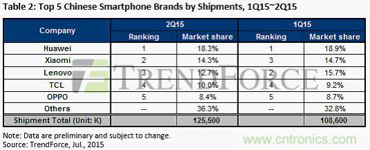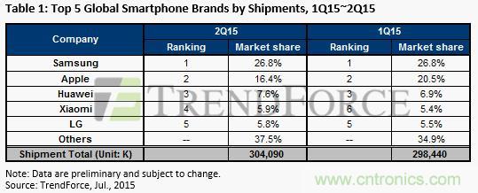 【導(dǎo)讀】近日,市場研究機(jī)構(gòu)TrendForce發(fā)布2015年度第二季度全球智能手機(jī)報告。中國的華為明顯獨(dú)領(lǐng)風(fēng)騷。數(shù)據(jù)顯示,三星雖然從蘋果手里奪回第一的寶座,但是,Q1和Q2 幾乎毫無變化。蘋果的市場份額則一調(diào)再掉,從Q1的20.5%掉到Q2的15.4%。華為的市場份額增加了7%,小米的份額增加了5%。