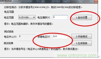 注意:由于GMW3122規(guī)定CANH+CANL的電壓要在4.2V~5.8V,而正常為5V。所以在采用對稱性測試時,其中使用的是(CANH+CANL)/2進行判別。 所以標準范圍為2.1V~2.9V,正常為2.5V。因此圖7中誤差電壓需要填入0.4。