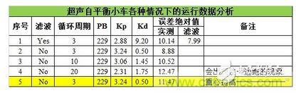 誤差絕對值是指小車在一段時間內(nèi),實測距離與設定平衡點距離誤差絕對值的平均值;濾波是指程序中對超聲波測量的距離濾波或不濾波直接使用;循環(huán)周期是程序中的延時時間,超聲波測量需要大約704us,一個周期大約為3.84ms,程序處理時間大約為136us.