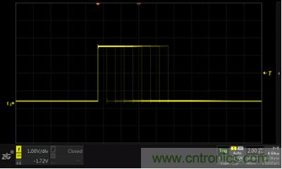 對(duì)于周期性的波形信號(hào)來(lái)說(shuō),自動(dòng)測(cè)量相對(duì)于光標(biāo)測(cè)量來(lái)說(shuō),統(tǒng)計(jì)的數(shù)據(jù)量多,測(cè)量結(jié)果為統(tǒng)計(jì)數(shù)據(jù)的平均值,相對(duì)來(lái)說(shuō)更加準(zhǔn)確。但是如果信號(hào)噪聲很大,自動(dòng)測(cè)量則有可能將噪聲也統(tǒng)計(jì)進(jìn)去,所得結(jié)果也會(huì)有較大誤差。自動(dòng)測(cè)量項(xiàng)目一般為常規(guī)項(xiàng)目,當(dāng)有特殊需求時(shí),自動(dòng)測(cè)量便無(wú)能為力了,比如測(cè)量下圖抖動(dòng)波形。