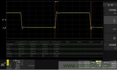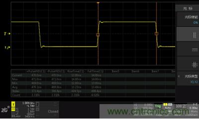 為什么會(huì)出現(xiàn)這種情況呢?示波器自動(dòng)測(cè)量的門(mén)限是為Vtop與Vbase之間50%的位置,所以測(cè)量的結(jié)果也是以50%處為準(zhǔn),這種測(cè)量方法也更為科學(xué)。在用光標(biāo)測(cè)量時(shí),如果將測(cè)量點(diǎn)選在Vtop與Vbase的50%處,這樣測(cè)出的結(jié)果便和自動(dòng)測(cè)量結(jié)果相差無(wú)幾了。如下圖,光標(biāo)測(cè)量470ns,自動(dòng)測(cè)量470.1ns。