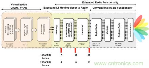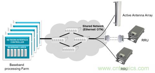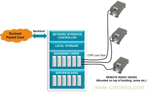射頻單元位于緊鄰塔頂天線的位置,以避免功率損耗。這些遠(yuǎn)端射頻單元通過光纖連接至基帶 BTS 機(jī)架。制定的通用公共無線接口(CPRI) 協(xié)議用來傳輸數(shù)據(jù)和同步遠(yuǎn)端射頻。在有些無法使用光纖的情況下,使用微波或毫米波無線電來傳送 CPRI 有效負(fù)載。這種架構(gòu)轉(zhuǎn)變使運(yùn)營商有望能夠混合使用和匹配來自不同系統(tǒng)廠商的無線電和基帶機(jī)架,以降低成本,改善供應(yīng)鏈,以及簡化庫存管理。然而互操作性問題讓這種希望化為了泡影,不過為一級(jí)系統(tǒng)廠商開啟了新方法,使其能夠利用來自小廠商的無線電設(shè)備來控制針對(duì)不同地區(qū)的無線電設(shè)備種類的快速增長。