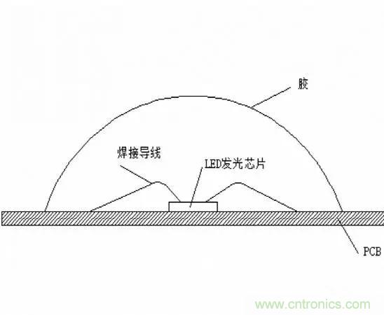 COB封裝,是英語Chip On Board的縮寫,直譯就是芯片放在板上。 是一種區(qū)別于DIP和SMD封裝技術(shù)的新型封裝方式。如圖所示