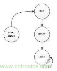 CPLD其內(nèi)部沒有RAM,這樣就不能依靠RAM的初始化數(shù)據(jù)來產(chǎn)生可靠的復(fù)位;從原理上說,器件上電后,其寄存器的狀態(tài)是不確定的,因此我們是沒法得到一個(gè)確定的初始狀態(tài)去產(chǎn)生一個(gè)可靠的內(nèi)部復(fù)位信號(hào),不過我們還是可以產(chǎn)生一個(gè)有一定失敗概率但概率可控的復(fù)位信號(hào),其基本原理是:設(shè)計(jì)一個(gè)n位的狀態(tài)機(jī),見下圖,其中一種狀態(tài)表示復(fù)位結(jié)束(記為L(zhǎng)OOP),只要進(jìn)入該狀態(tài)就會(huì)一直保持在LOOP狀態(tài)上,至于其他狀態(tài)都會(huì)跳入復(fù)位狀態(tài)(記為RESET),RESET狀態(tài)是暫態(tài),一個(gè)時(shí)鐘周期就離開進(jìn)入LOOP狀態(tài);由于狀態(tài)LOOP出現(xiàn)的概率僅為:1/2n,我們控制n的長(zhǎng)度,就可以將復(fù)位失敗概率控制在設(shè)定的要求內(nèi)。