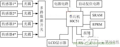 壓力測量控制系統(tǒng)的結(jié)構(gòu)如圖1所示, 它以80C51單片機為核心, 包括傳感器、光耦、多路數(shù)據(jù)開關(guān)、LCD液晶顯示器、SRAM, EPROM、自動復(fù)位電路、RS-485接口電路及高效電源電路等。下面分別介紹一下它們各自的設(shè)計特點。