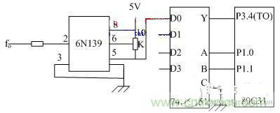 由圖2看出,傳感器頻率信號是通過光電耦合器6N139耦合到74HC151的輸入引腳D0。80C51的P1.0, P1.1輸出控制碼,選擇D0--D3輸入中的一路,用單片機的T0測信號頻率。