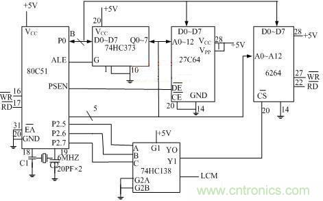 在80C51單片機中,外部I/O口是作為外部RAM來擴展的,選址的方法與擴充外部RAM的方法完全相同。本電路除了外部的RAM外,還有LCD顯示器作為外部I/O器件,因此,只采用線選址方式是不夠的,應(yīng)采用譯碼選址方式。