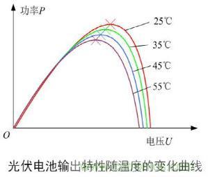 在一定的光照強度和環(huán)境溫度下,光伏電池可以工作在不同的輸出電壓,但是只有在某一輸出電壓值時,光伏電池的輸出功率才能達(dá)到最大值,這時光伏電池的工作點就達(dá)到了輸出功率電壓曲線的最高點,稱之為最大功率點。如圖2所示為MPPT受光照影響圖、圖 3所示為MPPT受溫度影響圖