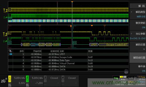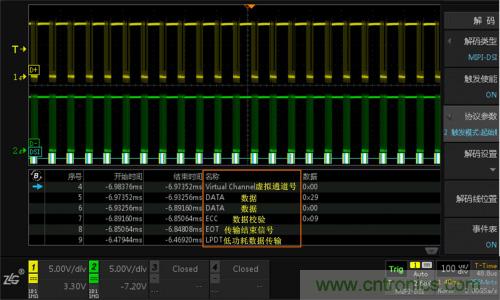 (1)現(xiàn)場模擬MIPI-DSI協(xié)議,使用數(shù)據(jù)挖掘型示波器ZDS4054 Plus,其免費標(biāo)配MIPI-DSI協(xié)議低速LP模式解碼功能,具體操作如下圖7所示。