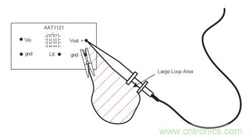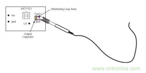 在測量中,如何減小拾取的輻射噪聲?最簡單可靠的方法是采用一個(gè)接地環(huán)來測量電源紋波以及噪聲。為了進(jìn)一步的降低測試誤差,可以將示波器探頭和地線直接放在電源輸出電容得兩端。如下圖所示,采用這種方法,在信號(hào)探頭和地線之間的環(huán)路面積很小,所以測量中帶來誤差的噪聲幾乎可以忽略。