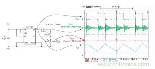 下圖描述了采用兩個(gè)不同的測試方法得到的Vout波形。電源電路是一個(gè)BUCK轉(zhuǎn)換電路(AAT1121),工作在1.5MHz的開關(guān)頻率,輸出電壓為1.8V/250mA。示波器采用全帶寬測試??梢钥吹桨殡S著PWM開關(guān),在綠色的trace2有一個(gè)很高的噪音以及振鈴,但是trace3上卻沒有明顯的噪聲。通過對(duì)比可以看到,測試方法的選擇對(duì)結(jié)果的準(zhǔn)確性很關(guān)鍵。