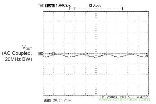 下圖是采用20MHz帶寬限制測試到的電源的紋波以及噪聲。示波器20MHz的帶寬限制是為了防止無源探頭帶入的共模噪聲??梢钥吹紸AT1121BUCK轉(zhuǎn)換器的紋波噪聲為10mVp-p,幾乎看不到開關(guān)噪聲。這主要是歸功于BUCK控制器的低噪聲設(shè)計(jì),良好的PCB設(shè)計(jì),以及恰當(dāng)?shù)臏y試方法。