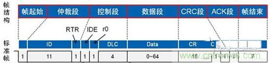 以標準數(shù)椐幀為例,從結構上看分成7段,分別為起始段、仲裁段、控制段、數(shù)椐段、CRC校驗段、ACK應答段、幀結束段,如圖1所示: