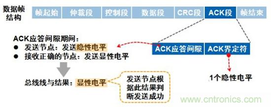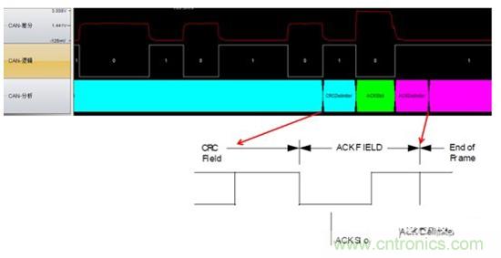 當一個接收節(jié)點接收的幀起始到CRC段之間的內容沒發(fā)生錯誤時,它將在ACK段發(fā)送一個顯性電平。 如圖3所示: