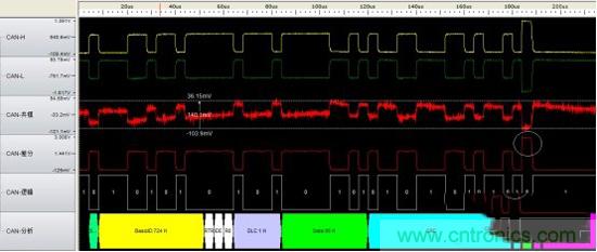 【導讀】CAN總線一直以實時性強、傳輸距離遠、抗干擾能力強、數(shù)據(jù)保證到達等特點而廣泛應用于高可靠性的場合。但常常在觀察CAN通信波形時,我們會發(fā)現(xiàn)差分電平在ACK段突然增高,這是什么原因導致的呢?這里結合測試實例對ACK電平偏高的原因做簡單分析。