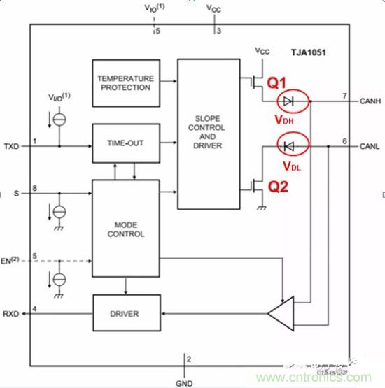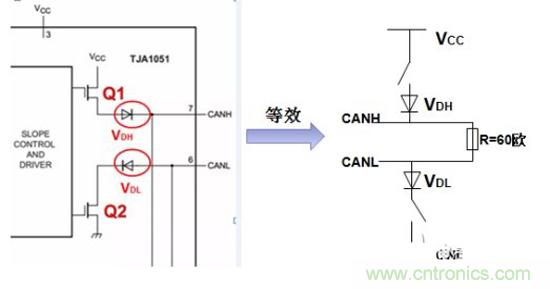 總線顯性時(邏輯為0),收發(fā)器內部Q1、Q2導通,CANH、CANL之間產生壓差;隱性時(邏輯為1),Q1、Q2截止,CANH、CANL處于無源狀態(tài),壓差為0。