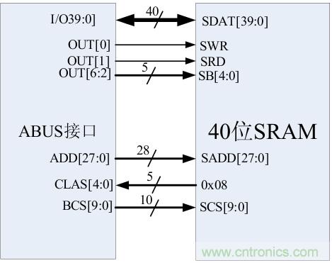40位SRM模塊與NIOSII通過ABUS連接,實現(xiàn)正確的時序讀寫操作。測試時,一次只測試8位,分5次完成所有空間的測試。如圖2-4。表4是詳細(xì)的信號連接說明。