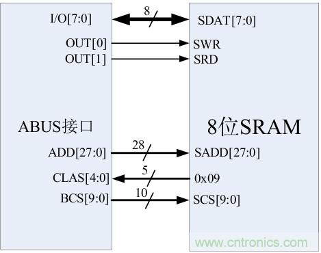 8位SRM模塊與NIOSII通過ABUS(FPGA)連接,實現(xiàn)正確的時序讀寫操作。如圖2-5。表5是信號連接說明。