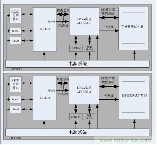 在測試NAND FLASH時,測試時間長達(dá)十個小時不等。在此為提高測試效率,增加測試速度,本設(shè)計采用兩套完全一樣且獨立的硬件系統(tǒng)構(gòu)成??赏瑫r最多測試2片NAND FLASH器件。每一個硬件系統(tǒng)由一個微處理器(NIOSII)加一個大容量FPGA及一個存儲器測試擴展接口(即ABUS接口)三大模塊構(gòu)成。如圖3-1。RS232通信接口實現(xiàn)測試系統(tǒng)與上位機的數(shù)據(jù)交換,完成人機交互操作。電源系統(tǒng)產(chǎn)生各種合適的電壓,滿足各芯片的電源供給。