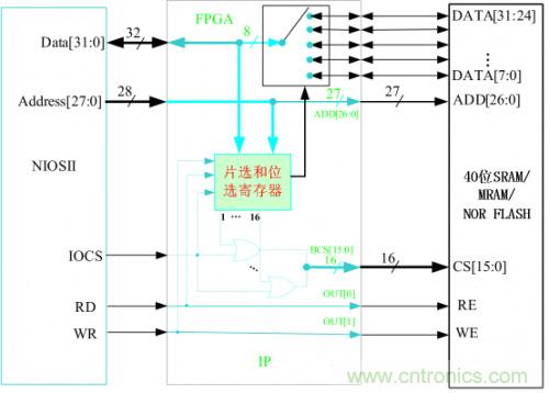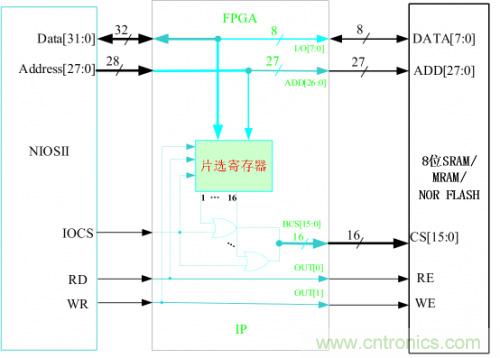 如圖4-3,SRAM、MRAM和NOR FLASH的接口操作基本一致,NIOSII的總線時序完全滿足。故在FPGA內(nèi)部只要簡單的把相應(yīng)的控制線和數(shù)據(jù)線相連就可以了,唯獨只要設(shè)計一個片選寄存器,用來區(qū)分SIP的16個片選。每一個片選可以訪問的空間為128MByte。片選寄存器的地址為(基址+0x0FFFFFFC),基地睛設(shè)在NIOSII 外部總線的最高地址位。