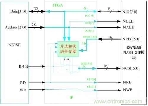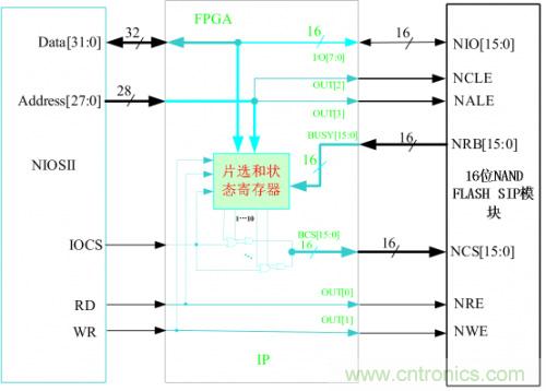 16位的NAND FLASH存儲器芯片可以有多種組合方式,可以用多個16位的NAND FLASH組合,也可以用多個8位的NAND FLASH組合。這里我們假設(shè)16位的SIP NAND FLASH產(chǎn)品是由多個16位的NAND FLASH組合而成,下面的IP核是根據(jù)它的結(jié)構(gòu)來設(shè)計的。