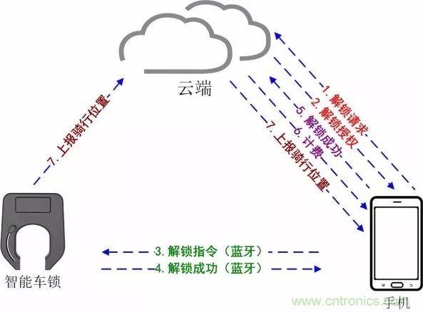 2.云端完成對用戶和單車的信息核查,并將解鎖指令發(fā)送給單車智能鎖,智能鎖開啟后向云端回復(fù)“解鎖成功”。(備注:部分共享單車在解鎖信息上報(bào)過程中,智能鎖會把下一次解鎖的密碼或秘鑰也一并上報(bào)給云端)(步驟2、3)