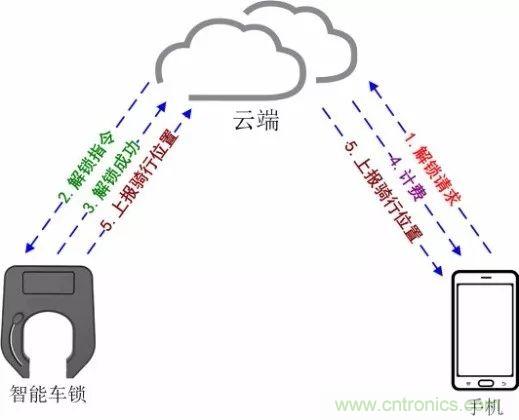 1.手機(jī)先掃單車上二維碼,而后向云端發(fā)起解鎖請求(請求中會攜帶掃碼單車的ID信息及用戶個(gè)人賬號信息)。云端對用戶信息、單車信息進(jìn)行核查,而后將授權(quán)信息發(fā)送給手機(jī)。(步驟1、2)