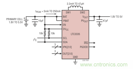 LTC3335 是一款毫微功率高效率同步降壓-升壓型轉(zhuǎn)換器,內(nèi)置了精確的庫(kù)倫計(jì)數(shù)器,提供高達(dá) 50mA 連續(xù)輸出電流。該器件具僅為 680nA 的靜態(tài)電流,可編程峰值輸入電流從低至 5mA 直至 250mA,非常適合多種低功率電池應(yīng)用,例如在可穿戴設(shè)備和 IoT 設(shè)備中見到的那些應(yīng)用。其 1.8V 至 5.5V 輸入電壓范圍和 8 個(gè) 1.8V 至 5V 的用戶可選輸出允許在輸入電壓高于、低于或等于輸出電壓時(shí),提供穩(wěn)定的輸出電源。此外,該器件集成的精確 (±5% 電池放電測(cè)量準(zhǔn)確度) 庫(kù)倫計(jì)數(shù)器可在長(zhǎng)壽命不可再充電的電池供電應(yīng)用中,對(duì)累積電池放電提供準(zhǔn)確監(jiān)視,這類應(yīng)用在很多情況下具極其平坦的電池放電曲線。典型應(yīng)用包括無(wú)線傳感器、遠(yuǎn)程監(jiān)視器和ADI的 Dust Networks SmartMesh系統(tǒng)。LTC3335 包含 4 個(gè)內(nèi)部低 RDSON MOSFET,可提供高達(dá) 90% 的效率。其他特點(diǎn)包括一個(gè)可編程放電報(bào)警門限、一個(gè)用于存取庫(kù)倫計(jì)數(shù)值和器件設(shè)定的 I2C 接口、一個(gè)電源良好輸出和 8 個(gè) 5mA 至 250mA 的可選峰值輸入電流以適合多種類型和尺寸的電池。采用耐熱增強(qiáng)型 20 引線 3mm x 4mm QFN 封裝的 LTC3335 的工作結(jié)溫范圍為 -40°C 至 +125°C。圖 2 顯示了 LTC3335 的典型應(yīng)用電路。