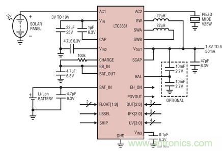 LTC3331 是一款完整的能量收集解決方案,提供高達(dá) 50mA 連續(xù)輸出電流,當(dāng)可收集能量可用時(shí)能延長(zhǎng)電池壽命。簡(jiǎn)便的 10mA 分流器用收集的能量給可充電電池充電,同時(shí)低電池電量斷接功能保護(hù)電池免于深度放電。當(dāng)用收集的能量向負(fù)載提供穩(wěn)定功率時(shí),該器件僅需要電池提供 200nA 電源電流,當(dāng)在無(wú)負(fù)載情況下由電池供電時(shí),僅需要 950nA 工作電流。LTC3331 集成了一個(gè)高壓能量收集電源、一個(gè)電池充電器和一個(gè)同步降壓-升壓型 DC/DC 轉(zhuǎn)換器,可為能量收集應(yīng)用提供一個(gè)持續(xù)穩(wěn)定的輸出,例如無(wú)線傳感器網(wǎng)絡(luò)中的能量收集應(yīng)用。能量收集電源由適合 AC 或 DC 輸入的全波橋式整流器和高效率降壓型轉(zhuǎn)換器組成,從壓電 (AC)、太陽(yáng)能 (DC)、或磁性 (AC) 能源收集能量。當(dāng)沒有收集能量可用時(shí),可充電電池輸入給降壓-升壓型轉(zhuǎn)換器供電,該轉(zhuǎn)換器在直至 4.2V 的整個(gè)電池電壓范圍內(nèi)運(yùn)行,無(wú)論輸入高于、低于或等于輸出,都可調(diào)節(jié)輸出。當(dāng)收集能源不再可用時(shí),LTC3331 自動(dòng)轉(zhuǎn)換至電池。LTC3331 的能量收集輸入在 3V 至 19V AC 或 DC 電壓范圍內(nèi)運(yùn)行,從而使該器件非常適合多種壓電、太陽(yáng)能或磁性能源。其輸入欠壓閉鎖門限設(shè)定是可編程的,范圍為 3V 至 18V,從而使應(yīng)用能夠在峰值功率傳送點(diǎn)上運(yùn)行能量收集電源。其他特點(diǎn)包括引腳可編程輸出電壓和降壓-升壓峰值電流限制、一個(gè)超級(jí)電容器平衡器和一個(gè)輸入保護(hù)性分路器。LTC3331 采用耐熱增強(qiáng)型 5mm x 5mm QFN 封裝。圖 3 顯示了 LTC3331 的典型應(yīng)用電路。