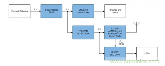 電機驅(qū)動器:驅(qū)動電流、電源電壓范圍、負載電機類型和安全關閉功能都是選擇電機驅(qū)動器時的因素。DRV8833可以驅(qū)動多種類型的電機和感性負載,峰值電流為2A,電源電壓范圍為2.7V至10.8V,非常適合使用四節(jié)AA電池。標稱驅(qū)動電壓電池的電壓是5V。