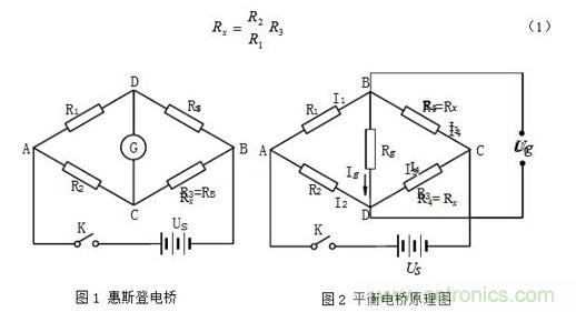 惠斯登電橋(平衡電橋)的原理如圖1所示,調(diào)節(jié)R3使檢流計(jì)G無電流流過時(shí),C、D兩點(diǎn)等電位,電橋平衡,從而得到