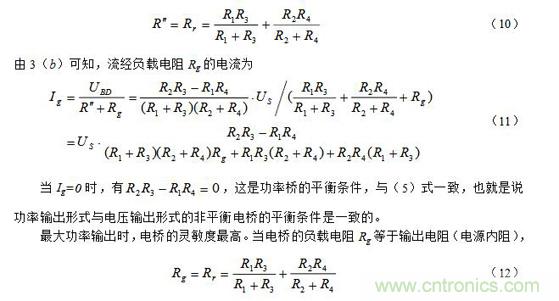 (3)Rg相對(duì)橋臂電阻可比擬時(shí)的非平衡電橋(功率輸出形式)當(dāng)負(fù)載電阻Rg與橋臂電阻可比擬時(shí),則電橋不僅有輸出電壓Ug,也有輸出電流Ig,也就是說有輸出功率,此種電橋也稱為功率橋。功率橋可以表示為圖3(a)。