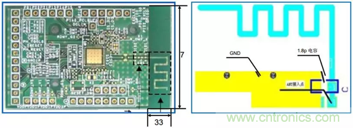 曲流型天線的長度比較難確定。長度一般比四分之一波長稍長,其長度由其幾何拓撲空間及敷地區(qū)決定。曲流型天線一般是PCB封裝,即板載天線。和倒F型一樣,天線一般放置在PCB頂層,鋪地一般放在頂層并位于天線附近,但天線周圍務必不能放置地,周圍應是凈空區(qū)。如圖2,圖3: