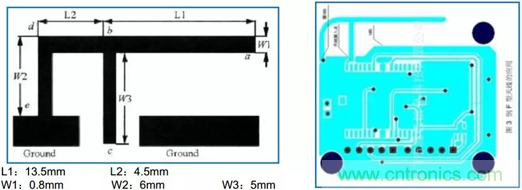 倒F型天線的天線體可以為線狀或者片狀,當使用介電常數(shù)較高的絕緣材料時還可以縮小藍牙天線尺寸。作為板載天線的一種,倒F型天線設計成本低但增加了一定體積,在實際應用中是最常見的一種。天線一般放置在PCB頂層,鋪地一般放在頂層并位于天線附近,但天線周圍務必不能放置地,周圍應是凈空區(qū)。如下圖: