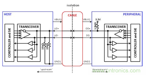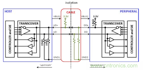 一種可能的隔離方法如圖2a所示。圖中,虛線表示隔離在理論上將USB電纜分割。D+和D–的狀態(tài)信息可以跨越隔離柵,但電流不能。GND1節(jié)點(diǎn)(上游的接地基準(zhǔn))現(xiàn)在與GND2節(jié)點(diǎn)(下游的接地基準(zhǔn))相互分離。不幸的是,隔離使主機(jī)無法“看到”下游的上拉電阻,而外設(shè)無法“看到”上游的下拉電阻。因此,需要使用一些額外的電阻,如圖2b所示,以便跨越隔離模仿相應(yīng)連接。在這個“透明”概念中,主機(jī)與外設(shè)之間的通信方式和圖1中的非隔離式連接十分類似。透明的USB隔離器元件可方便地插入收發(fā)器和USB電纜之間,并使用隔離電源。原本設(shè)計用于非隔離式應(yīng)用的主機(jī)和外設(shè)可方便地連接USB隔離器并交換標(biāo)準(zhǔn)USB信號,無需大幅改動設(shè)計。