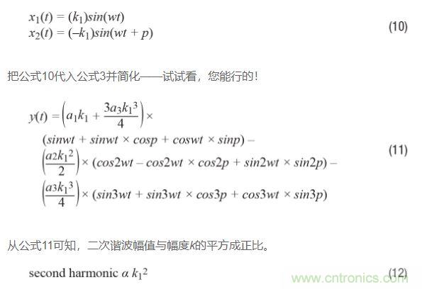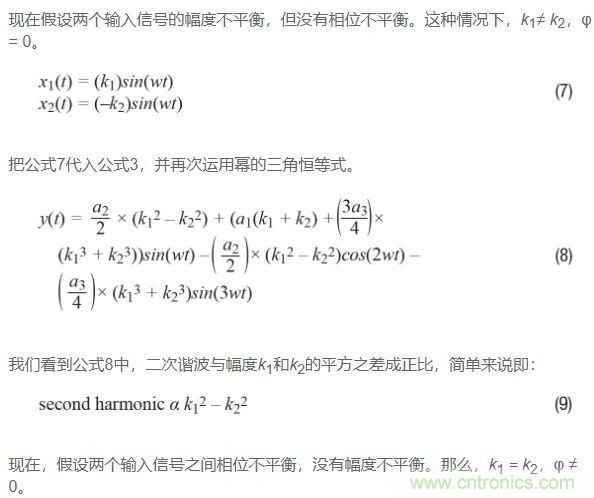如果回過(guò)頭比較公式9和公式12,并且假設(shè)三角恒等式運(yùn)用正確,那么可以得出如下結(jié)論:二次諧波受相位不平衡影響比受幅度不平衡影響更嚴(yán)重。原因如下:對(duì)于相位不平衡,二次諧波與k1的平方成正比;再看公式12,對(duì)于幅度不平衡,二次諧波與k1和k2的平方差成正比,或看公式9。由于k1和k2大致相等,因此這種差異通常很小,特別是如果將其與平方數(shù)進(jìn)行比較!