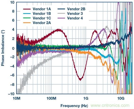 圖3揭示的HD2失真曲線(xiàn)方差量證明,需要進(jìn)一步考察巴倫的性能,特別是相位和幅度不平衡。以下兩幅圖顯示了不同制造商的幾款巴倫的相位和幅度不平衡。使用網(wǎng)絡(luò)分析儀來(lái)測(cè)量不平衡。
