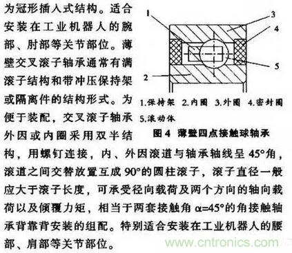 球軸承是機(jī)器人和機(jī)械手機(jī)構(gòu)中最常用的軸承。它能承受徑向和軸向載荷,摩擦較小。其機(jī)器人專用軸承四點(diǎn)接觸式設(shè)計以及高精度加工。這種軸承比同等軸徑的常規(guī)中系列四點(diǎn)接觸軸承輕25倍。它的內(nèi)圈(或外圈)由兩個半圈精確拼配而成,而其整體外圍(或內(nèi)圈) 的溝曲率半徑較小,使鋼球與內(nèi)、外圈在四個“點(diǎn)”上接觸。既加大了徑向負(fù)荷能力,又能以緊湊的尺寸承受很的兩個方向的軸向負(fù)荷,并且有很好的兩個方向的軸向限位能力,因?yàn)樗妮S向游隙相對較小。而其接觸角 (一般取為35)又較大。工業(yè)機(jī)器人專用薄壁四點(diǎn)接觸球軸承通常有帶密封圈和不帶密封圈的結(jié)構(gòu)形式(見圖4)。其主要由內(nèi)圈、外 圍、保持架、鋼球或非接觸式密封圈組成。內(nèi)、外圈均為整體結(jié)構(gòu)。鋼球與內(nèi)、外因溝道呈四點(diǎn)接觸.保持架為冠形插入式結(jié)構(gòu)。