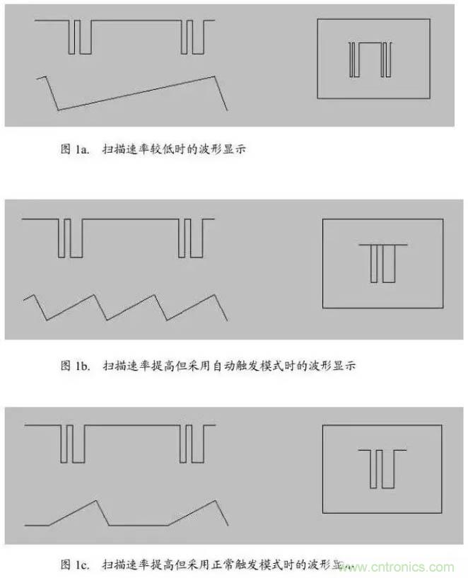 圖1 是這種情況的圖解,在圖1 中,左側(cè)上方是被觀測的波形,下方是掃描波形,右側(cè)是波形的顯示。圖1a中掃描速率較低,不便于觀察波形的細(xì)節(jié);圖1b將掃描速率提高,采用自動(dòng)觸發(fā)模式,這時(shí)顯示的波形是不清晰的,有混疊現(xiàn)象;圖1c中的掃描速率與圖1b相同,但采用正常觸發(fā)方式,僅在有觸發(fā)時(shí)才進(jìn)行掃描,因而顯示清晰的波形。