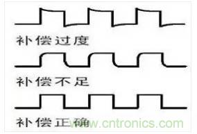 3.如果波形不正確,請(qǐng)調(diào)整探頭。如下圖三所示,直至波形為上面的補(bǔ)償正確波形。