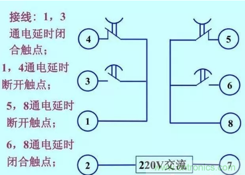 5-8腳為通電延時(shí)閉合觸點(diǎn),接通電源,給了信號(hào)之后線圈得電,等到設(shè)置時(shí)間到達(dá)以后,觸點(diǎn)閉合;