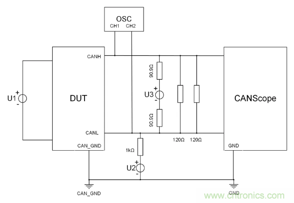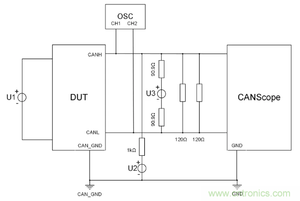 調節(jié)電壓源U3,逐步將差分電平調到隱性電平上限值0.5V,判斷DUT是否能夠正常發(fā)送報文,若能,則表示測試通過。